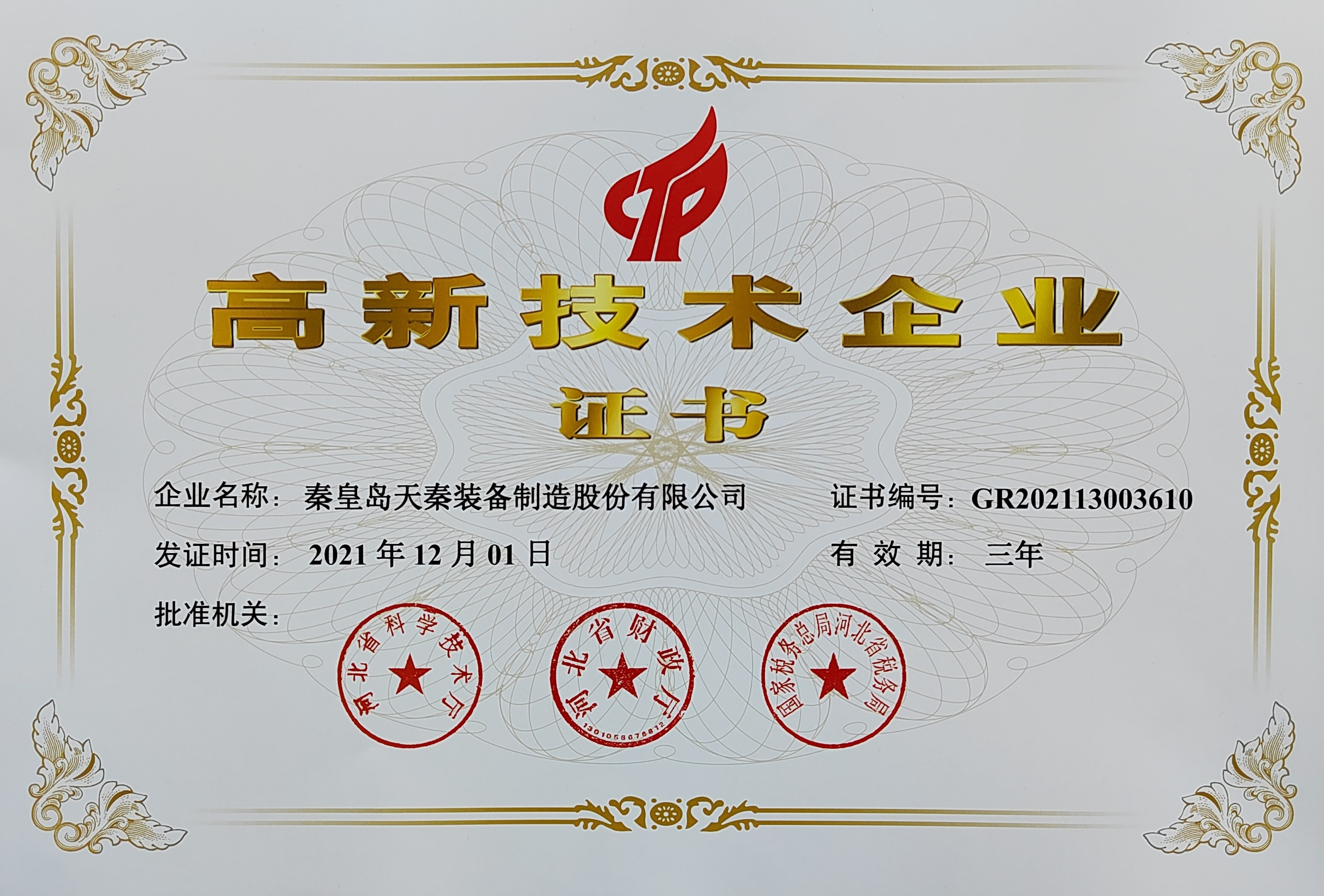 - 秦皇島天秦裝備制造股份有限公司創(chuàng)立于1996年,總部位于河北省秦皇島市經(jīng)濟(jì)技術(shù)開發(fā)區(qū),秦皇島廠區(qū)占地4萬平方米,擁有3萬平方米的標(biāo)準(zhǔn)廠房、辦公樓和工程技術(shù)研發(fā)中心;分部天津廠區(qū)位于天津市靜海經(jīng)濟(jì)開發(fā)區(qū),占地2萬平方米,擁有1.6萬平方米標(biāo)準(zhǔn)廠房。 公司通過了GB/T 19001質(zhì)量管理體系及GB/T 24001環(huán)境管理體系認(rèn)證,是國家高新技術(shù)企業(yè)、河北省軍民融合產(chǎn)學(xué)研用創(chuàng)建基地,建有省級院士工作站。